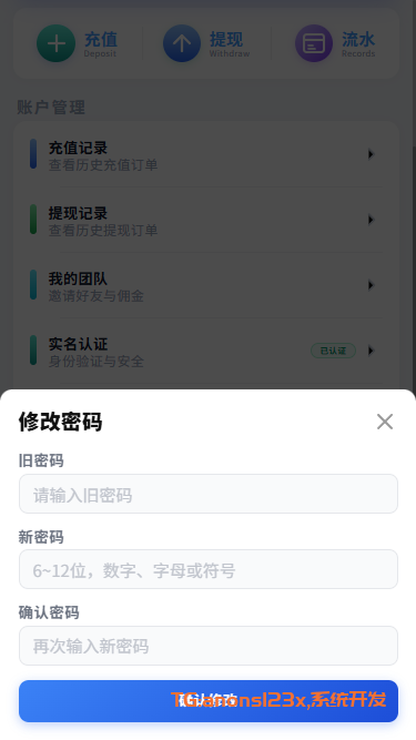 用户邀请注册自动绑定上下级关系,支持邀请链接与邀请码双通道。充值审核通过即触发三级返佣,佣金实时到账。团队页面可查看各级成员明细与返佣账单。