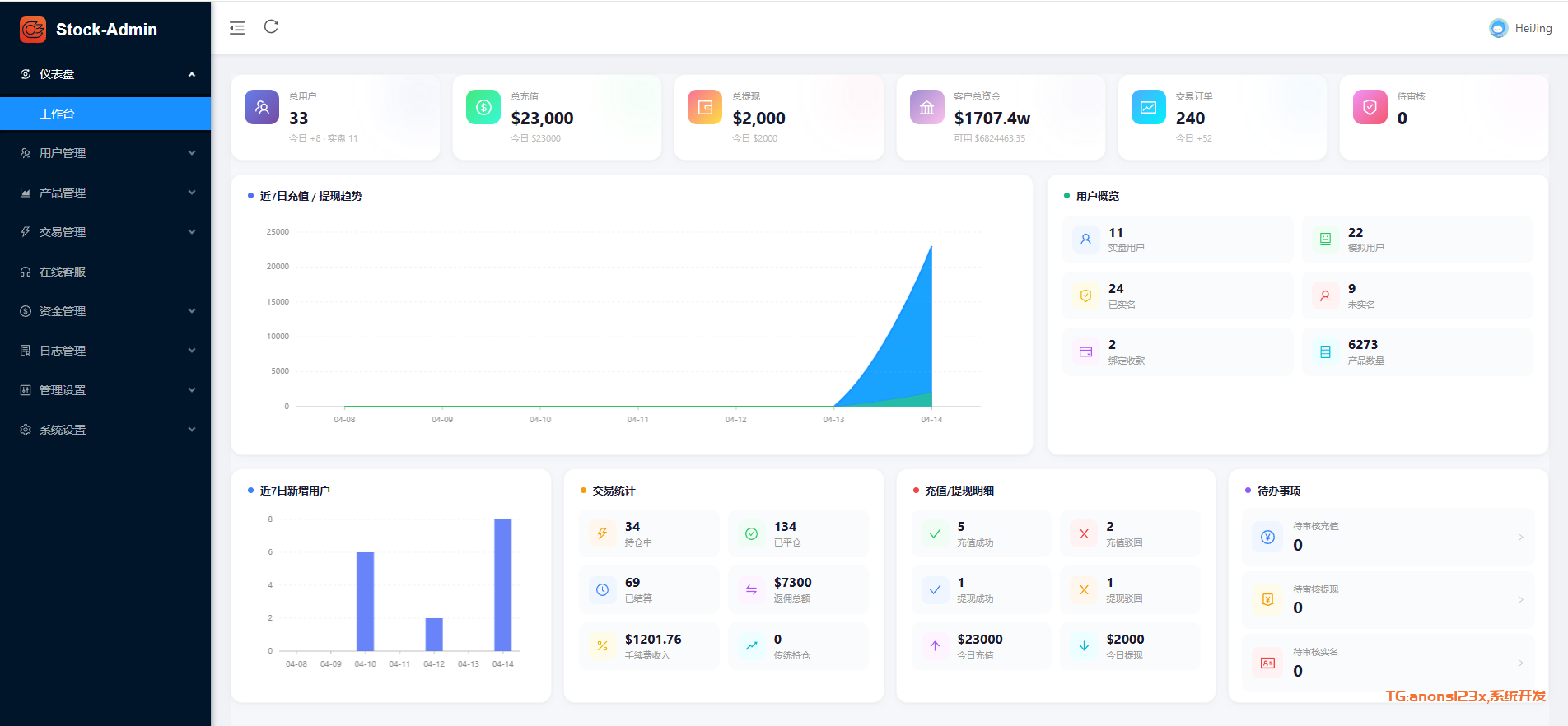 - 数据看板 — 用户、充值、提现、订单、手续费、返佣等核心指标一屏总览,近7日趋势图表直观呈现