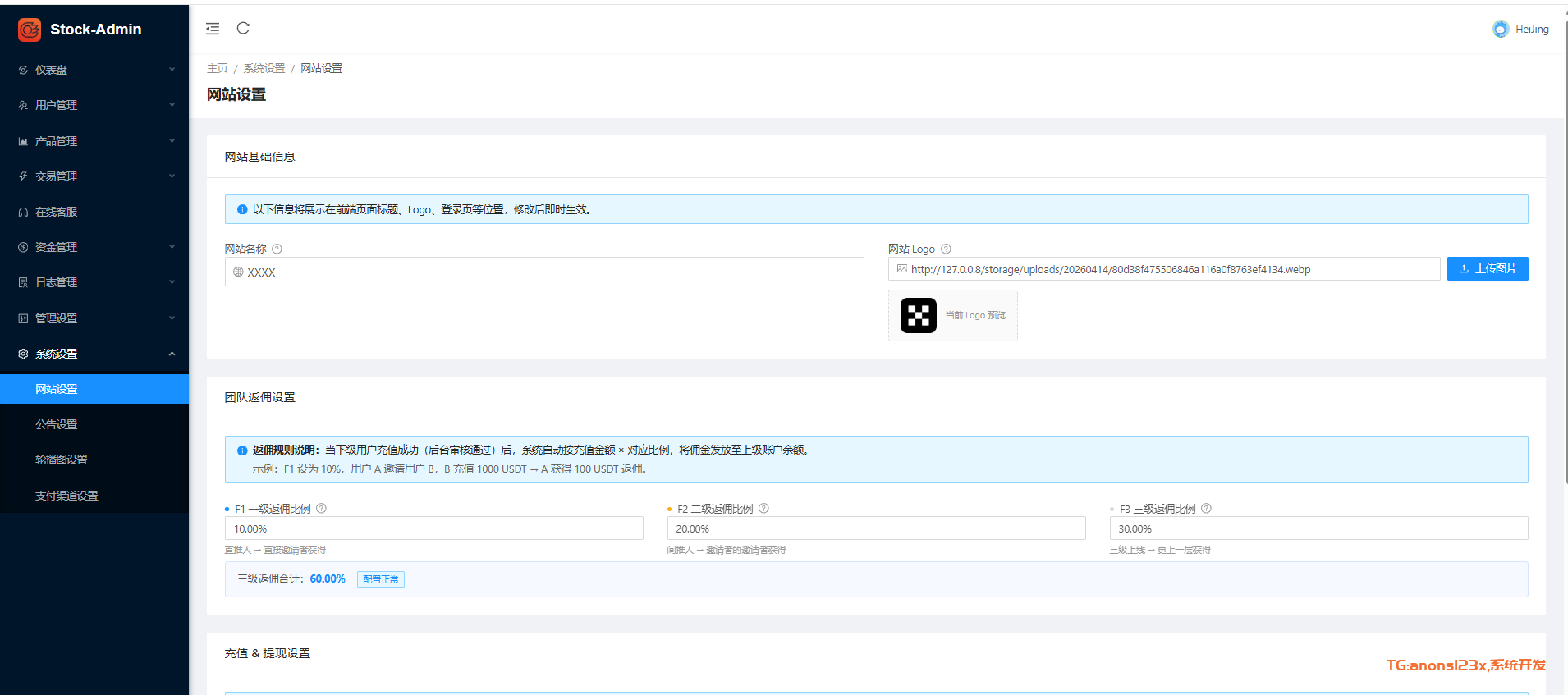 - 网站设置 — 站名Logo、返佣比例、手续费率、提现限额、提现时间窗口全后台可配