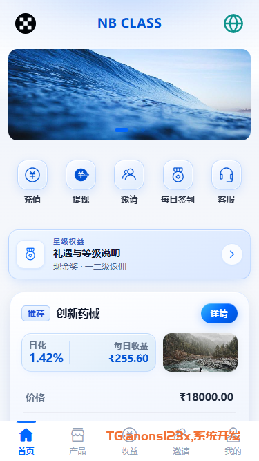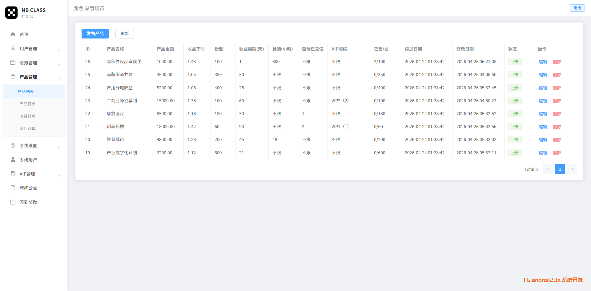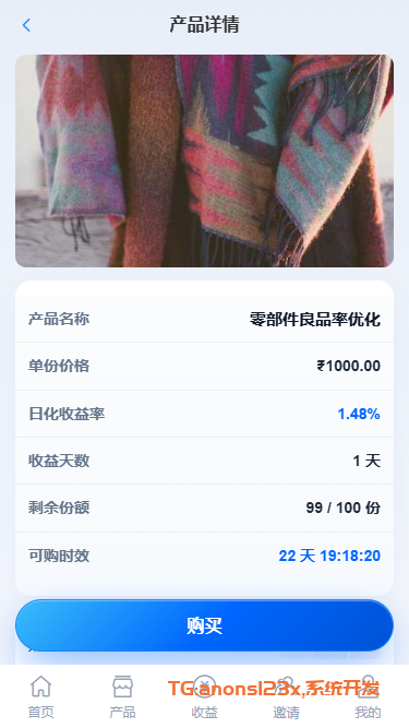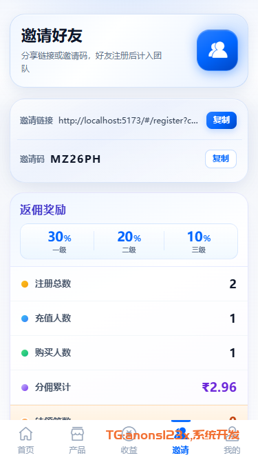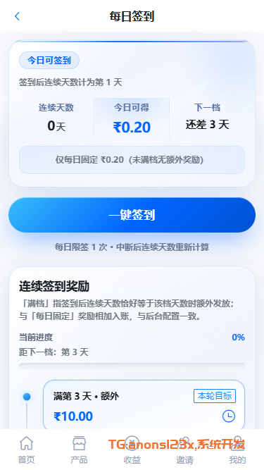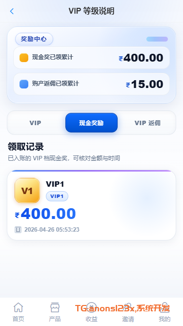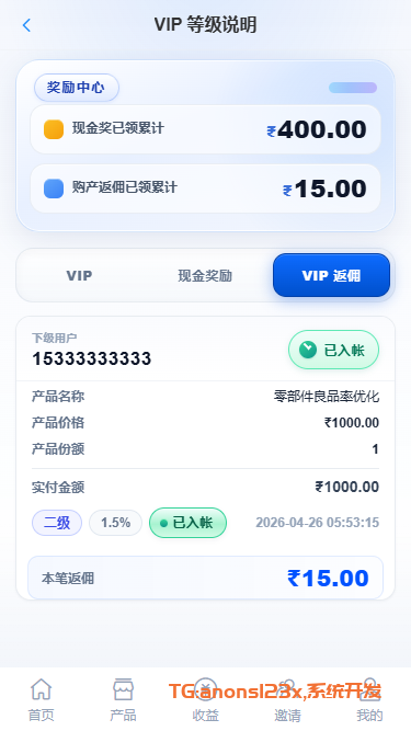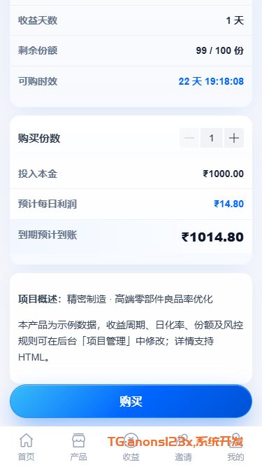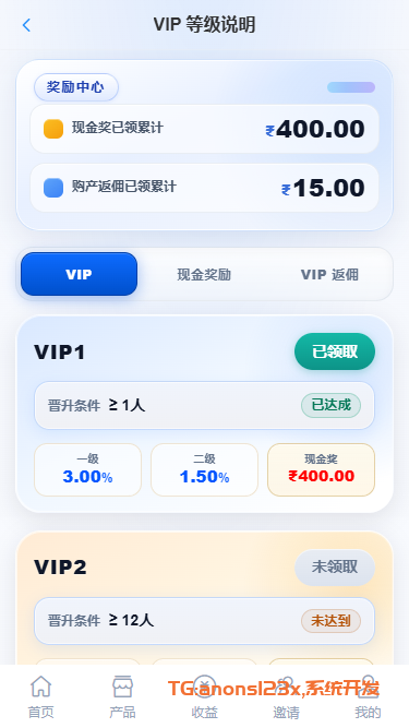 本项目是一套投资返利/理财类平台系统,支持会员购买产品份额并按日化收益率每日领取利息,到期返还本金;同时提供三级分销返佣、VIP晋升体系、签到奖励、充值提现等完整业务闭环。