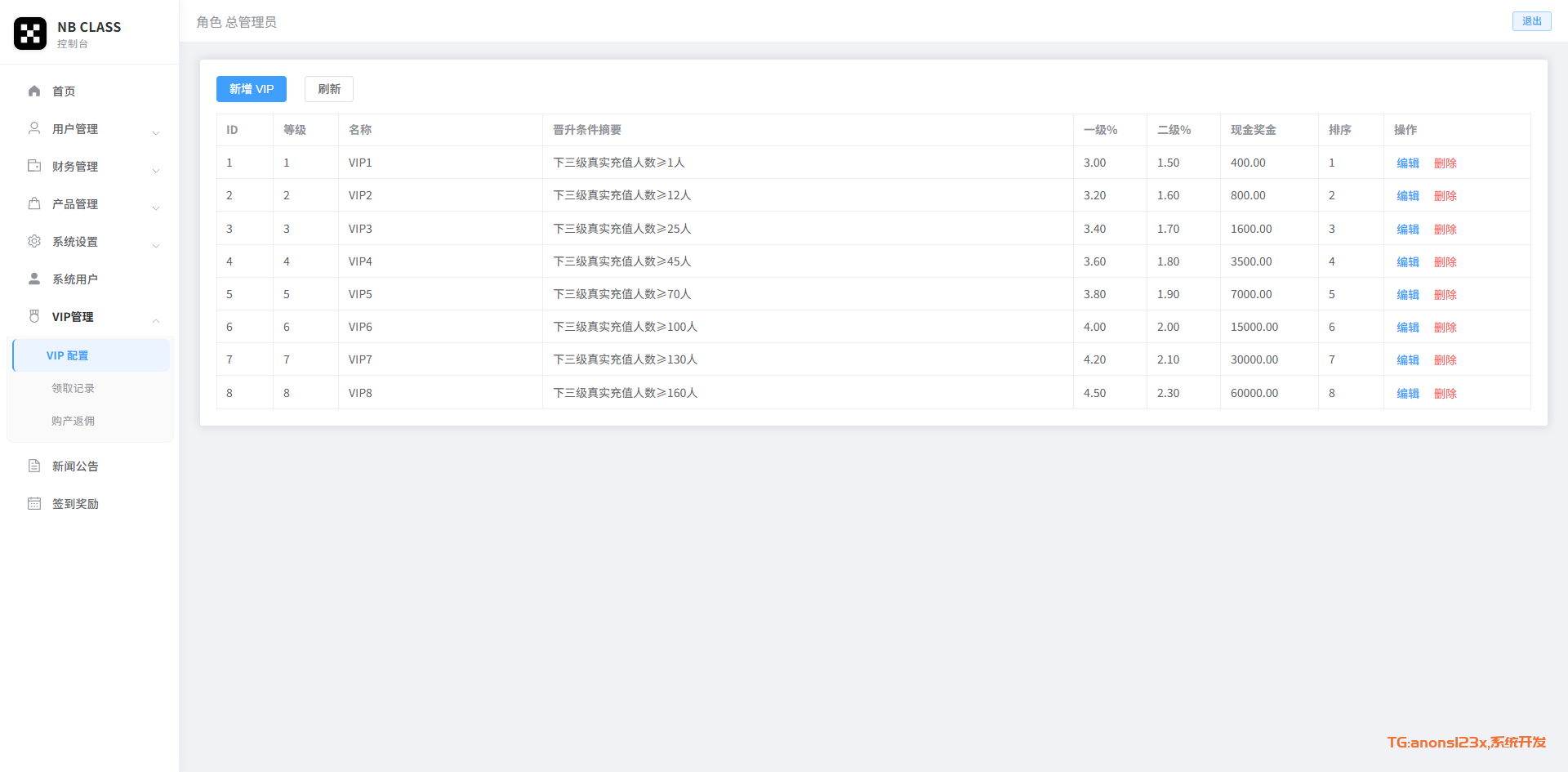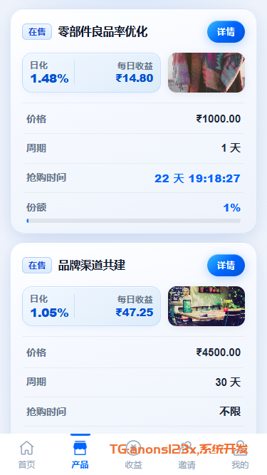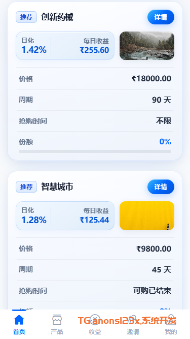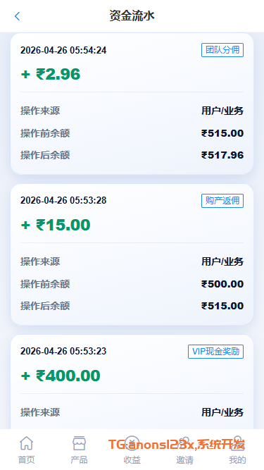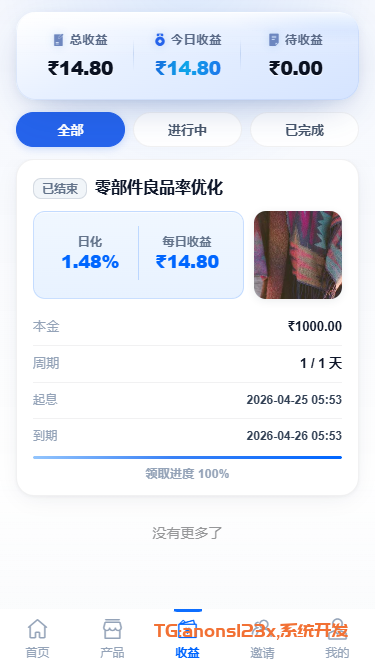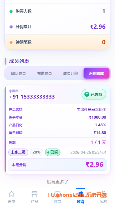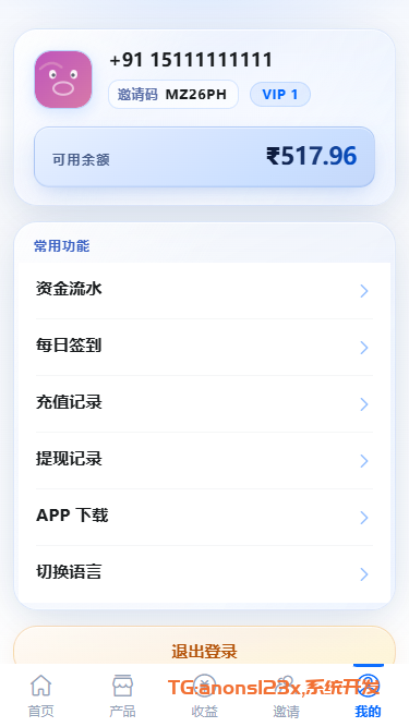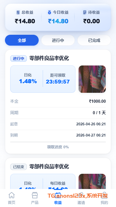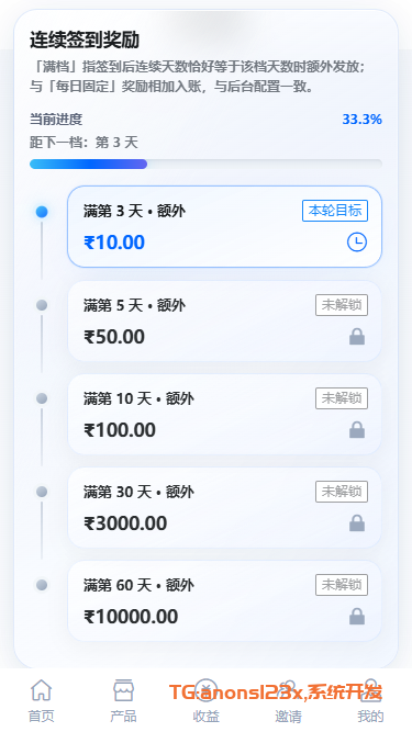 本项目是一套投资返利/理财类平台系统,支持会员购买产品份额并按日化收益率每日领取利息,到期返还本金;同时提供三级分销返佣、VIP晋升体系、签到奖励、充值提现等完整业务闭环。